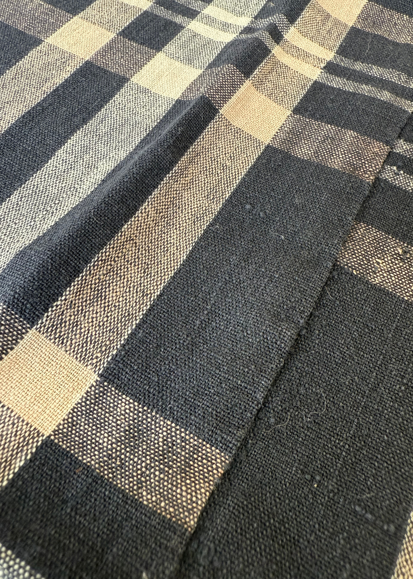 Hand-pieced in the quiet hours of rural Japan, this textile carries over a century of wear, repair, and reverence. Cut from a mid-to-late 1800s futonji—a patchworked bedding cloth made from dyed cotton scraps—this fabric tells the story of utility elevated to art. Stitches overlap like topographic lines, each mend a quiet act of resilience. Faded hues of deep indigo reveal years of use, sunlight, and life lived close to the earth.